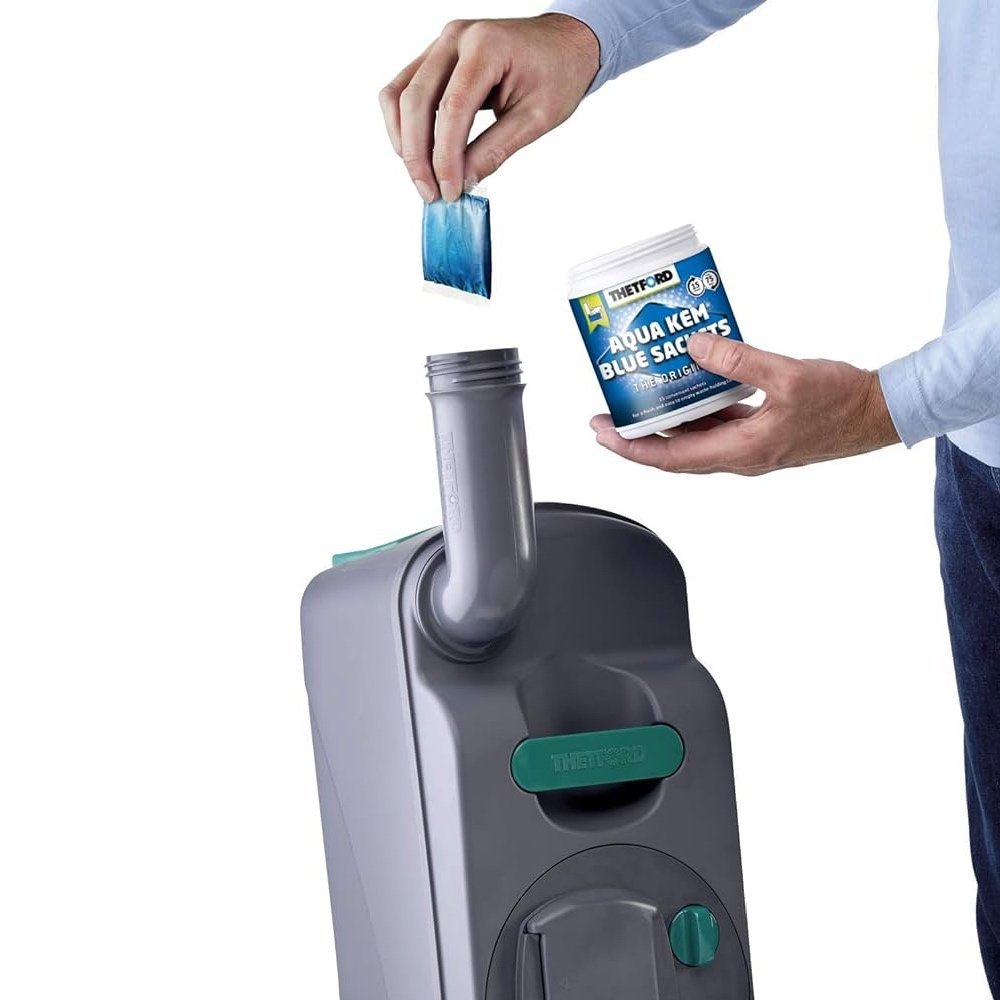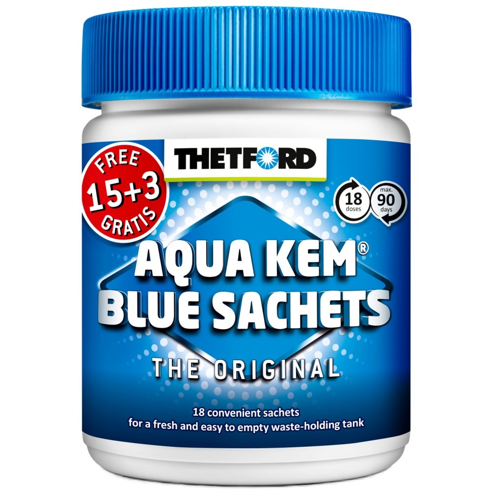 • Aqua Kem Blue – Powerful Waste Tank Sachets (Now with 3 Free Sachets – 18 Total!)Aqua Kem Blue is a powerful, easy-to-use toilet additive designed to improve the performance of waste tanks in both cassette and portable toilets. When used together with Thetford’s Aqua Rinse and Aqua Soft, it offers the ideal solution for everyday toilet use—whether on the road, at a campsite, or at home.