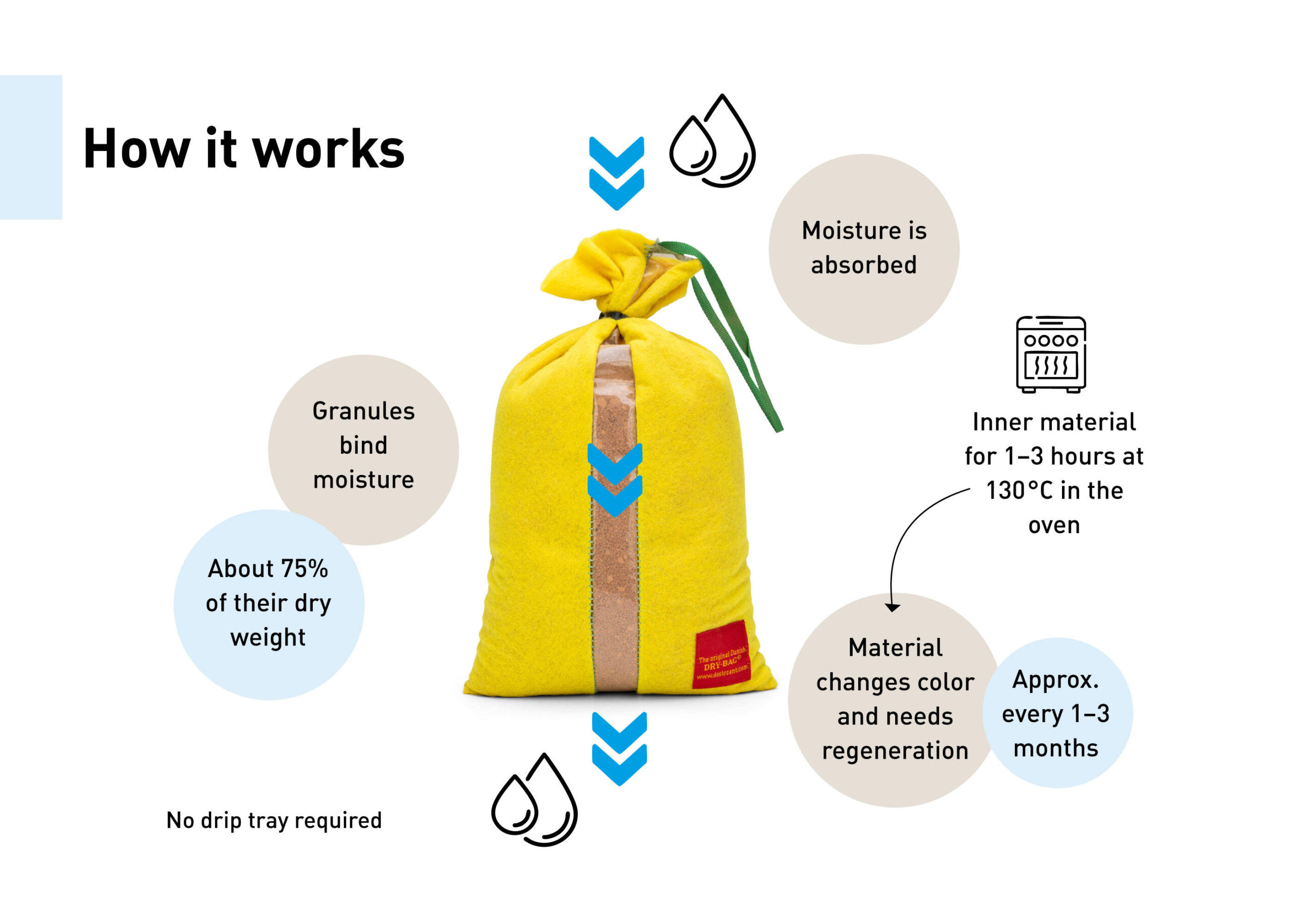 • However, it is generally recommended to regenerate your DRY-BAG every three months. Your DRY-BAG can be made ready for use again after 1-3 hours in the oven at 130°.
