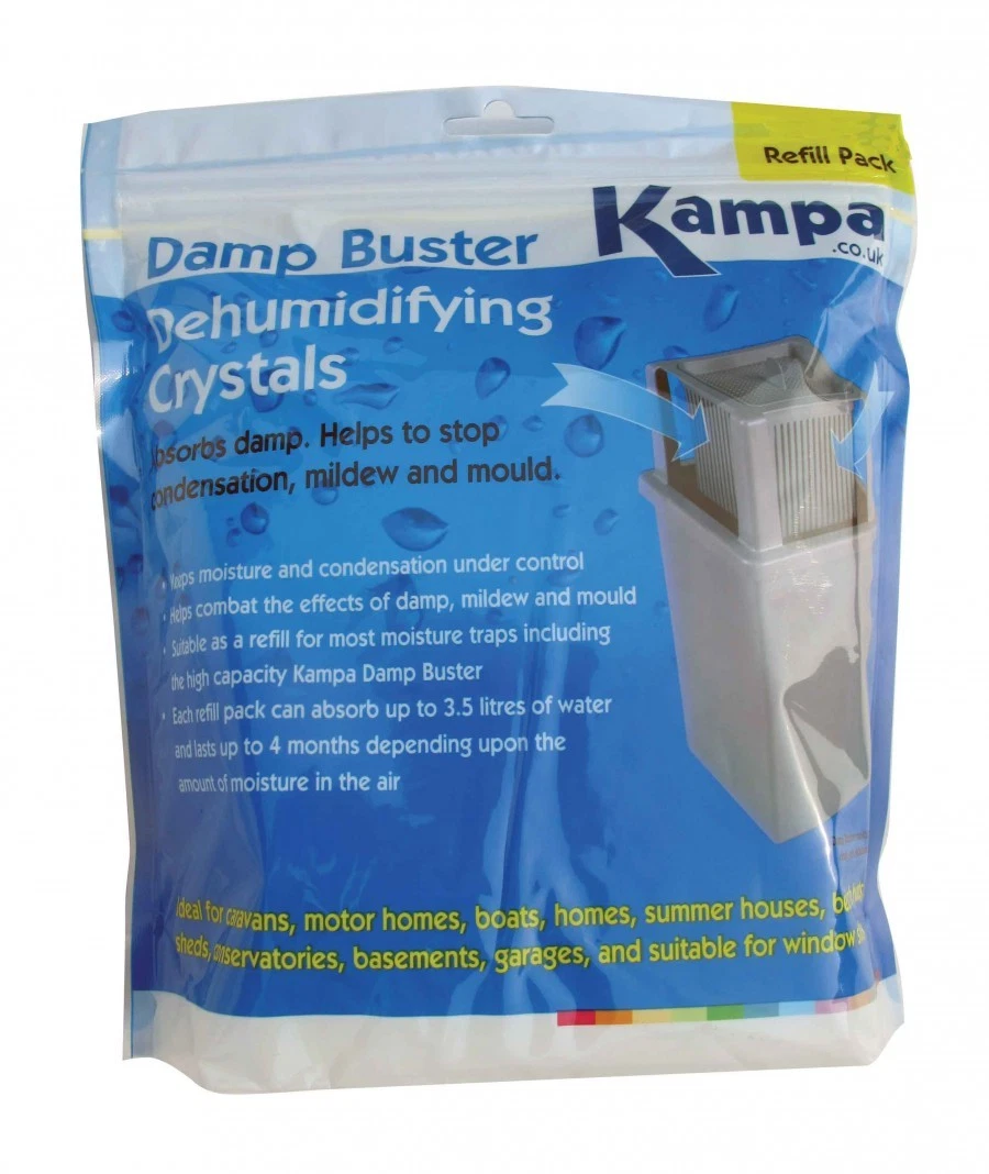 • Large, resealable bag of moisture crystals, suitable for use with Kampa’s moisture buster and damp buster.