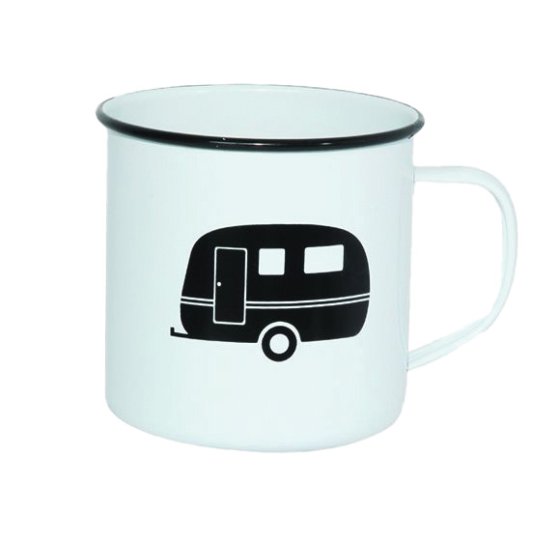• White & Black Enamel Coated Retro Mug with Retro style Caravan printed on side.